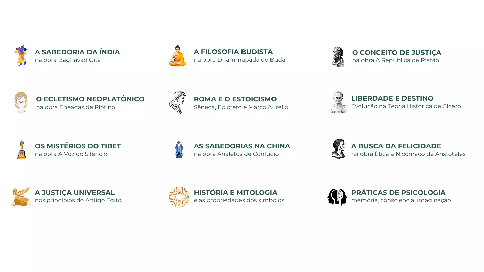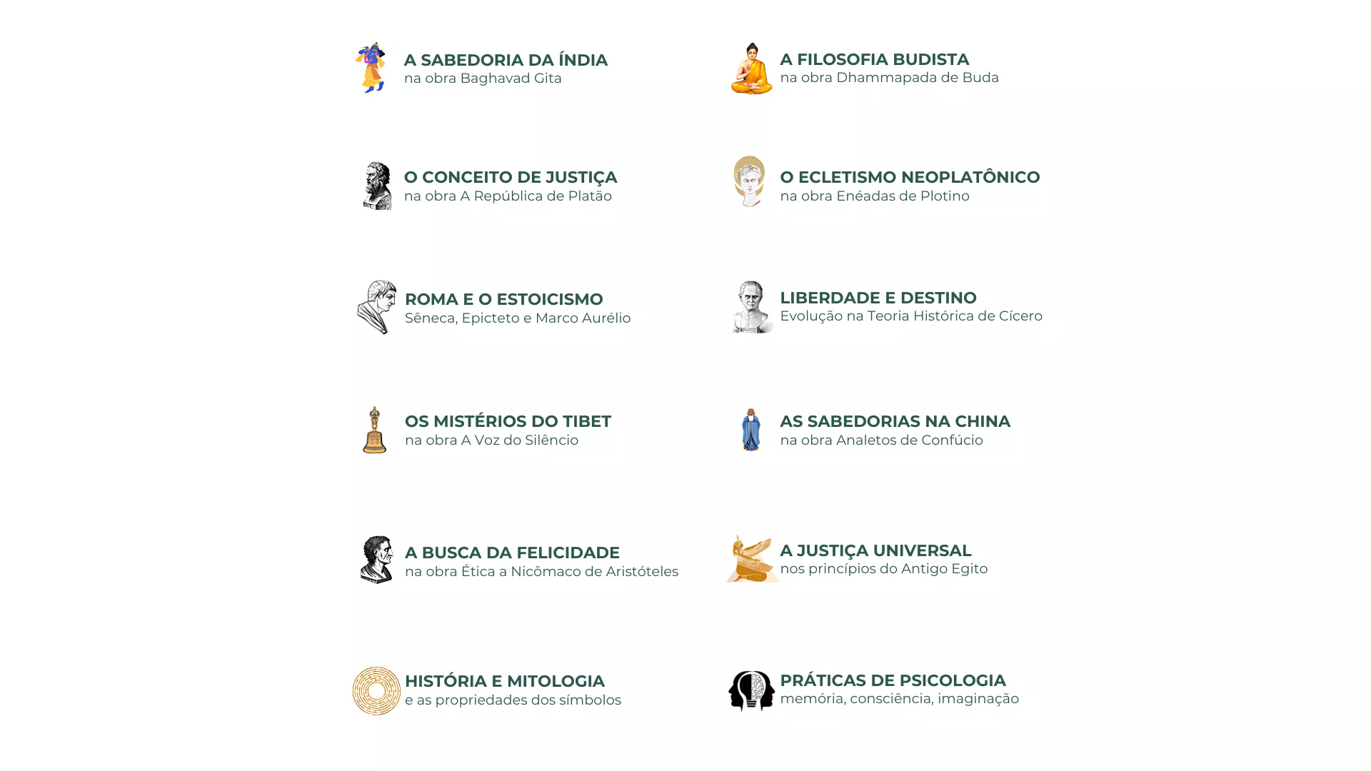 Nosso programa de estudos é validado em mais de 50 países e abrange a filosofia oriental, ocidental, moderna e clássica. Buscamos o melhor de cada tradição.